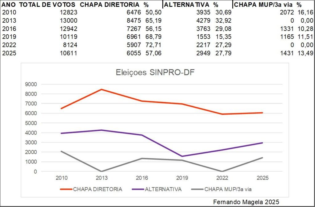 “(…) a análise dos números revela uma estagnação da gestão atual, mesmo diante do aumento do número do eleitorado. Em 2022, o total de votos foi de 8.124, com a Chapa 1 obtendo 5.907 votos e a Chapa 2 alcançando 2.217. Em 2025, houve um incremento expressivo de 2.487 eleitores, totalizando 10.611 votos válidos. Apesar disso, a Chapa 1 cresceu apenas 148 votos (chegando a 6.055). Já as chapas de oposição apresentaram um avanço considerável: a Chapa 2, mesmo com a divisão de votos da Chapa 3, aumentamos a votação em 732 votos (totalizando 2.949), e a Chapa 3 obteve 1.431 votos.