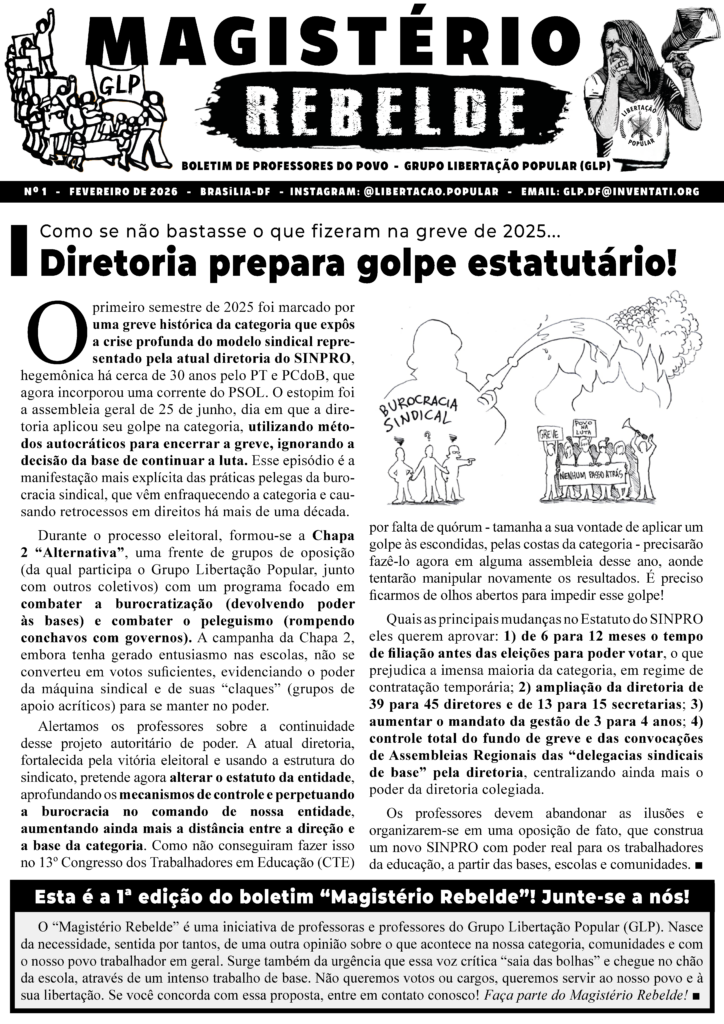 No dia 22 de fevereiro um coletivo de professores do Grupo Libertação Popular (GLP) passou em mais de 20 escolas da Ceilândia e Sol Nascente lançando a primeira edição do boletim Magistério Rebelde, um instrumento que pretende defender um novo paradigma de luta e organização na categoria de trabalhadores da educação, assim como colando cartazes contra o “golpe estatutário” arquitetado pela atual diretoria do SINPRO-DF (PT, PCdoB e PSOL). Nas escolas, os professores do povo passaram também na “salinha” dos terceirizados da limpeza conversando sobre a campanha contra as derrubadas de moradias populares e roubo de ambulantes pelo DF Legal, sendo muito bem recebidos, recebendo relatos e desabafos. A proposta é seguir fazendo trabalho de base em mais escolas até o dia da Assembleia Geral do Magistério dia 18 de março. Leia abaixo os textos do boletim Magistério Rebelde nº1: