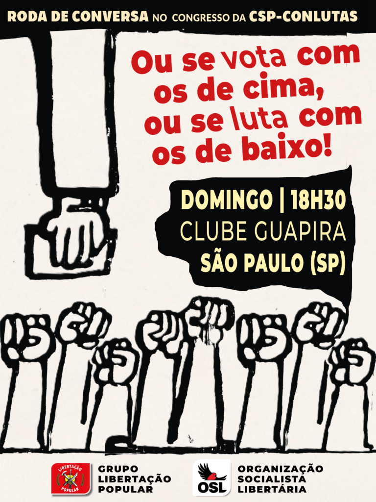 Por tudo isso, nós, enquanto organizações e militantes do movimento sindical e popular que constroem a CSP-Conlutas, convidamos todos e todas para uma conversa a fim de pensar as seguintes questões: 1) Independência de classe frente a burguesia e suas instituições – nenhum apoio a candidatos, nem gasto de energia nas eleições burguesas; 2) Defesa da ação direta – organizar a radicalização das lutas e combater a conciliação de classes e o peleguismo; 3) Contra o corporativismo: Unificação das lutas contra os ataques aos direitos do povo; 4) Atenção para a importância da construção de uma estrutura que dê conta do apoio e organização das lutas do proletariado marginal e setores precarizados da classe; 5) Democracia de base – crítica a reprodução de práticas burocráticas e ao disputismo dogmático nos processos organizativos.